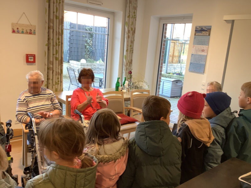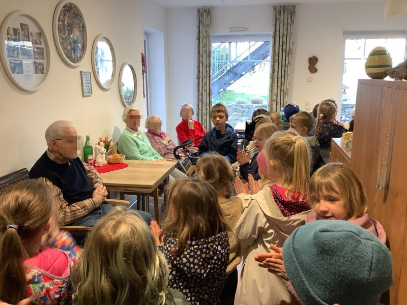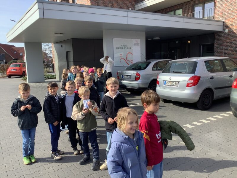 Am 20.03. besuchten unsere beiden ersten Klassen mit ihren Klassenlehrerinnen Frau Huber und Frau Böckerstette die drei Pflegeeinrichtungen in Bakum. Im Gepäck waren selbstgebastelte Osterkarten, die den Bewohnern und Bewohnerinnen überreicht wurden. Passend zur nahenden Osterzeit trugen die Kinder das Gedicht „Der Hase mit der roten Nase“ von Helme Heine vor. Die Senioren und Seniorinnen zeigten sich begeistert und sagten teilweise auch lange Ostergedichte auf oder sangen Osterlieder mit mehreren Strophen vor. Zum Dank bekamen die Kinder bei der Verabschiedung Süßigkeiten und ein Trinkpäckchen geschenkt.