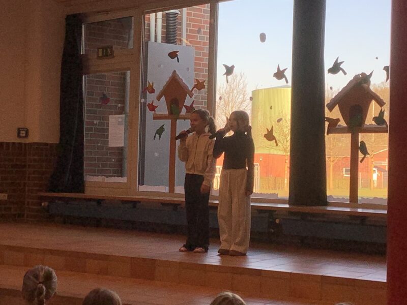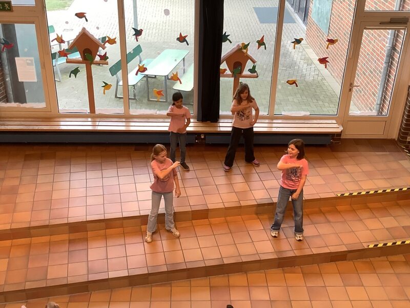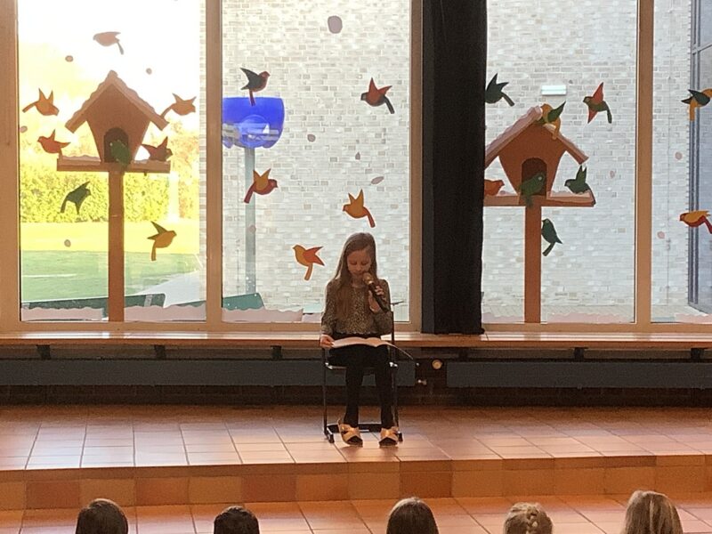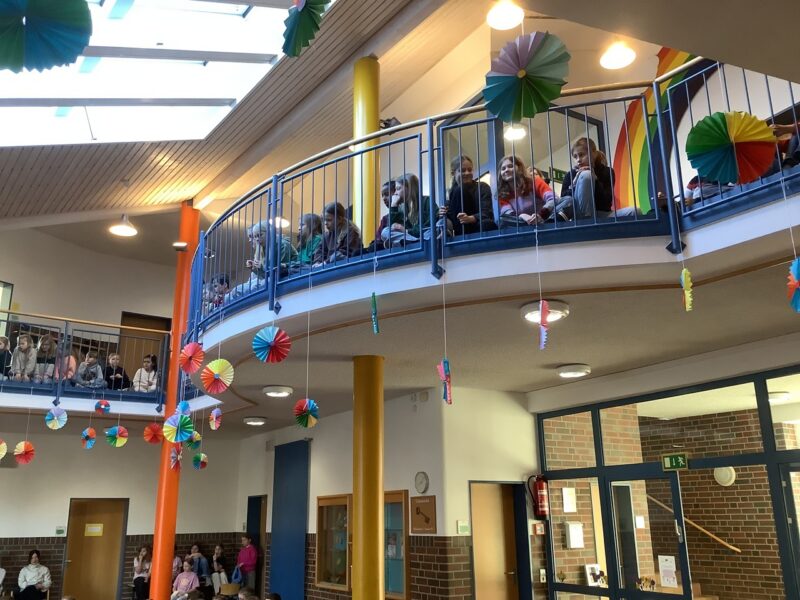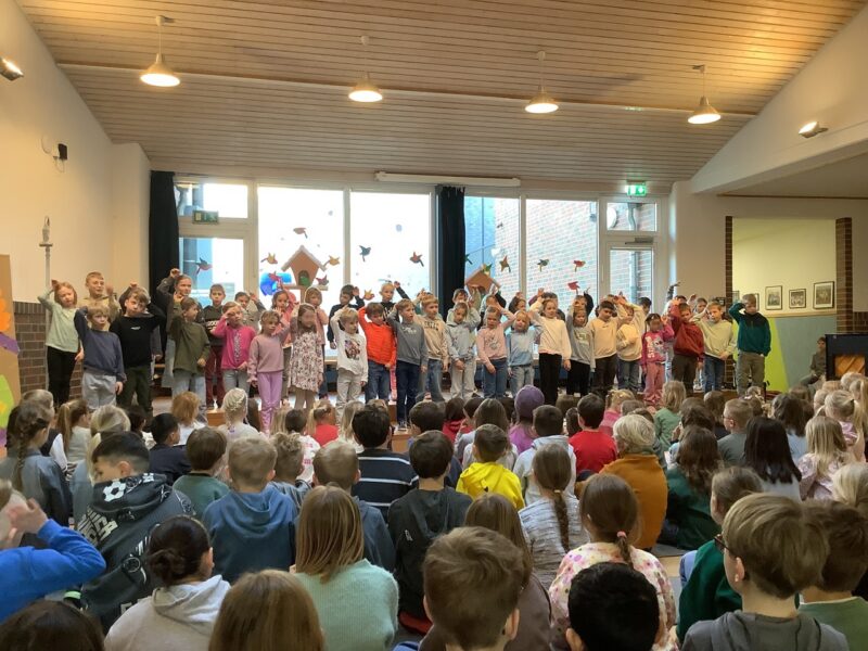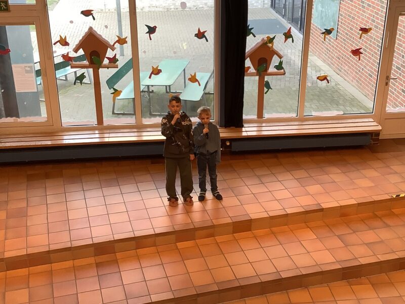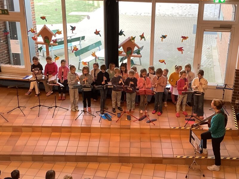 Den Anfang des Programms machten nach der Begrüßung die ersten Klassen, die das Gedicht „Der Hase mit der roten Nase“ mit viele Freude vortrugen. Danach sangen Mario und Anton aus der 3c zum Lied „Diamonds“. Charlotte aus der 4b las dem Publikum im Anschluss ihren spannenden Aufsatz vor. Es folgte die Blockflöten-AG, die eine spannende Musikgeschichte aus der Piratenwelt vorführte. Jonas aus der 3a spielte anschließend „Auf der Mauer, auf der Lauer“ auf seiner Gitarre. Es ging musikalisch weiter mit einem Tanz zu „Lush Life“, den uns Lina, Emma, Zoey und Leni aus der 4a präsentierten. Außerdem sangen Nadine und Lotta aus der 3c zu „Die with a smile“. Zum Abschluss wurde noch gemeinsam das neue Schullied gesungen. Frau Schubert-Hoin schloss die Veranstaltung mit einer Verabschiedung in die anstehenden Ferien.