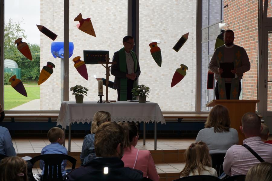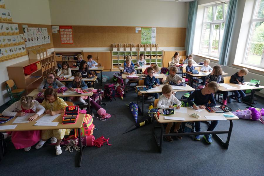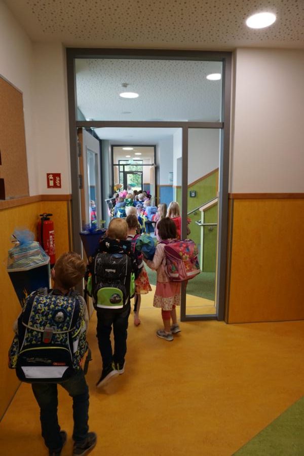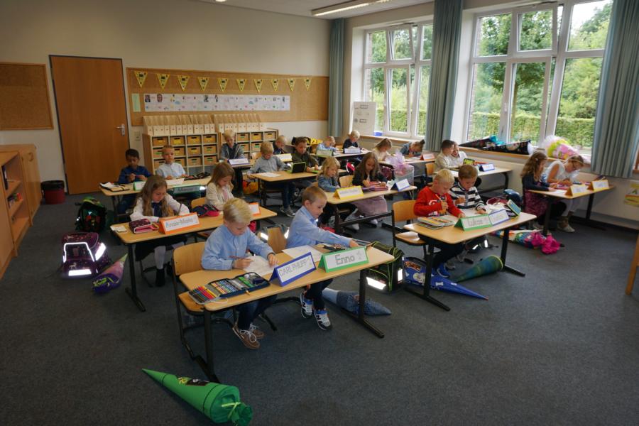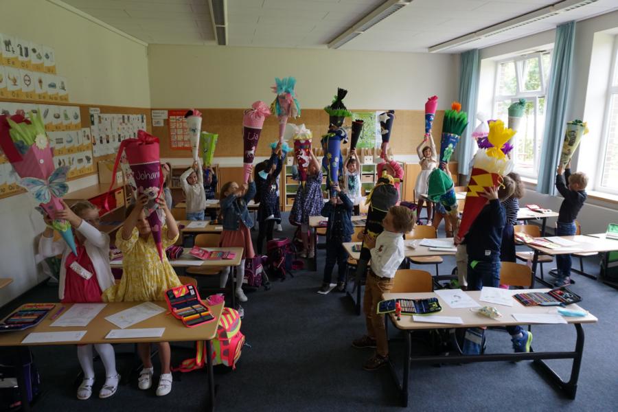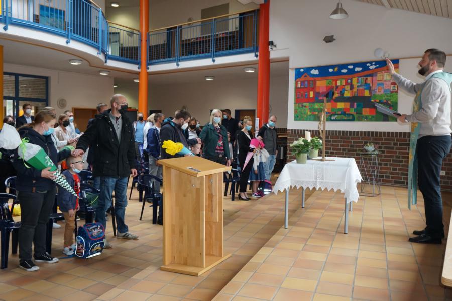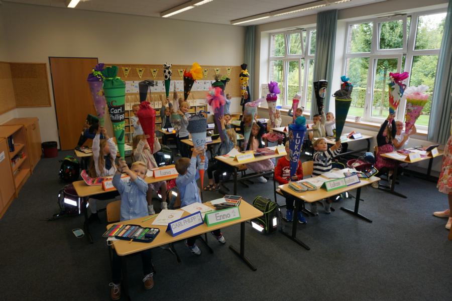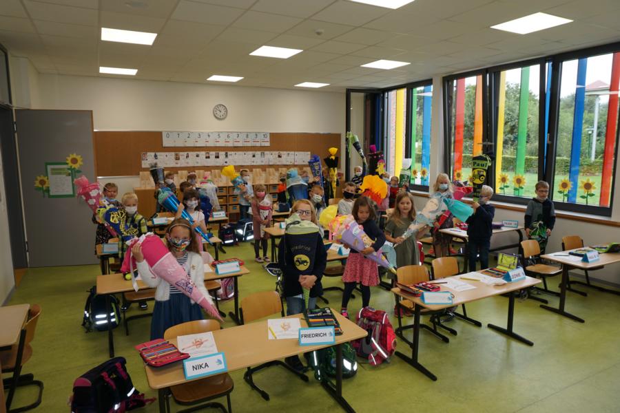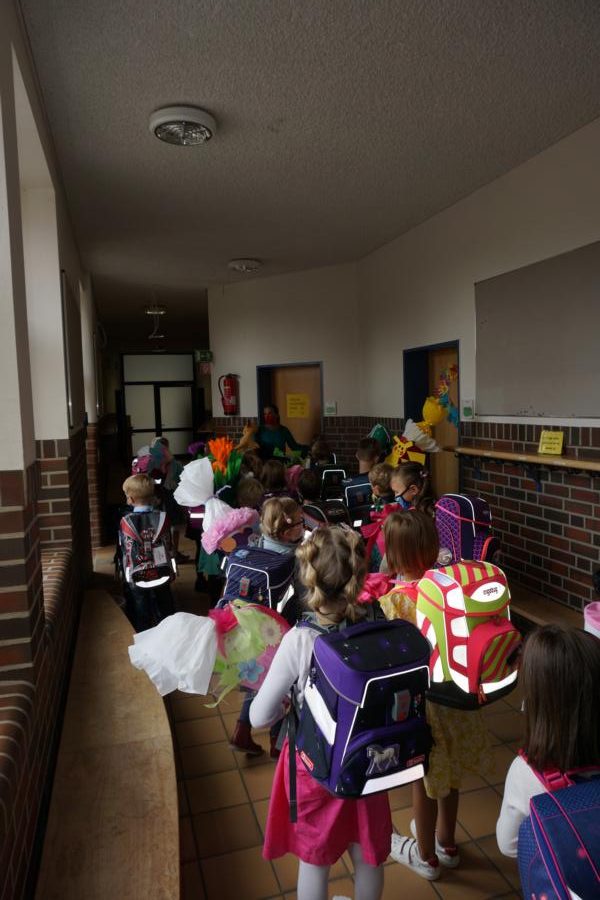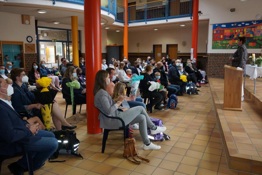 Am Samstag (04.09.2021) wurden unsere neuen Erstklässlerinnen und Erstklässler in drei Etappen eingeschult. Zunächst wurde in der Pausenhalle ein Wortgottesdienst gefeiert. Frau Schubert-Hoin gab den Kindern viele gute Wünsche mit auf den Weg. Dann nahmen die Klassenlehrerinnen Frau Böckerstette (1c), Frau Rolfes (1a) und Frau Anter-Vogelsang (1b) die Schülerinnen und Schüler mit dem Beginn der Geschichte vom Löwen, der nicht schreiben konnte, in Empfang. Wie die Geschichte weiterging, erfuhren die Kinder im Anschluss während ihrer ersten Unterrichtsstunde im Klassenraum. Unterdessen wurden den Eltern von Frau Huber wichtige Informationen zu den ersten Schultagen mitgeteilt. Auf dem Schulhof stellte sich der Förderverein vor und bot Getränke an.